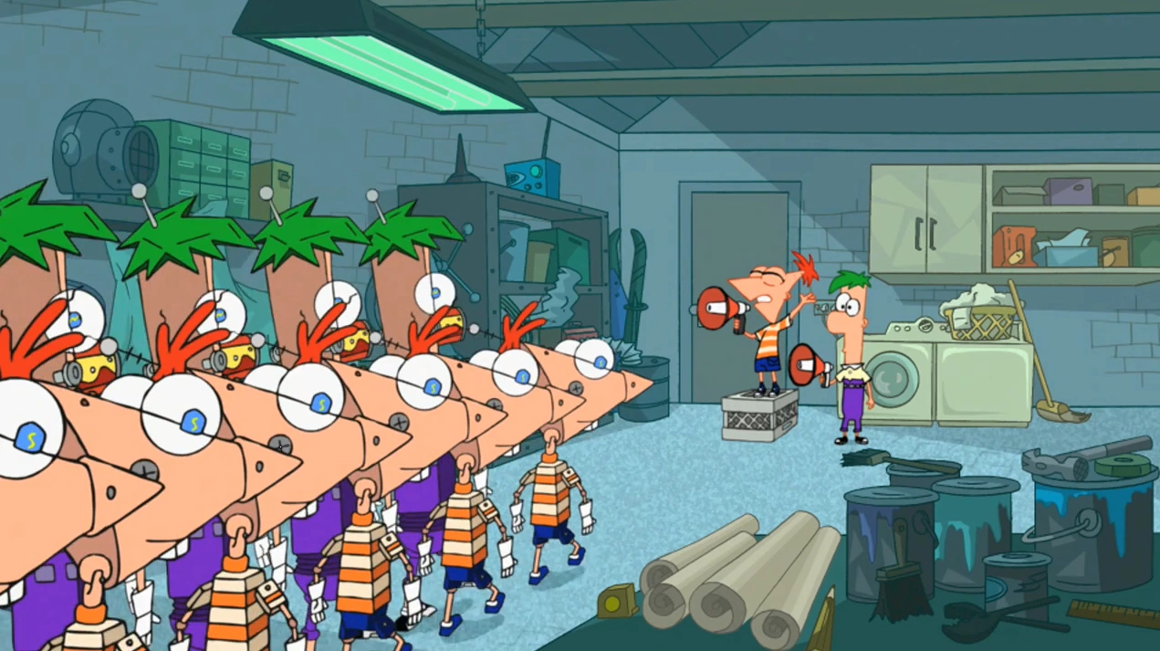 Die Jungs sitzen unter einem Baum im Garten und gehen die Möglichkeiten durch, was sie heute tun könnten. Zur Auswahl stehen ein komplett nahrungsmittelbasierter Wasserpark, ein Tunnel zum Zentrum der Erde, eine Kammer der Unsichtbarkeit und ein mikroskopisch kleiner Zoo, der auf dem Kopf einem Reißnagel ruht. Als die Erkenntnis sinkt, dass sie viele Entwürfe, Modelle und Baupläne haben, veranlasst ein fallendes Blatt Phineas zu kommentieren: "Der Sommer hält nicht ewig an und wir haben zu viele Pläne um sie alle umzusetzen. Wir brauchen mehr Zeit oder mehr Phineas und Ferbs." Ferb übergibt seine Pläne für einen Roboter, und das gibt Phineas eine Idee: Phinedroids und Ferbots bauen.